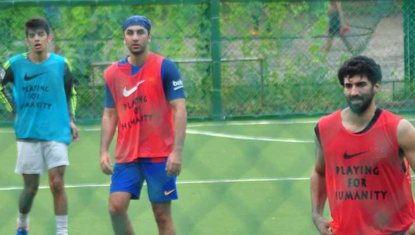 Ranbir Kapoor and Aditya Roy Kapoor were snapped while playing football.